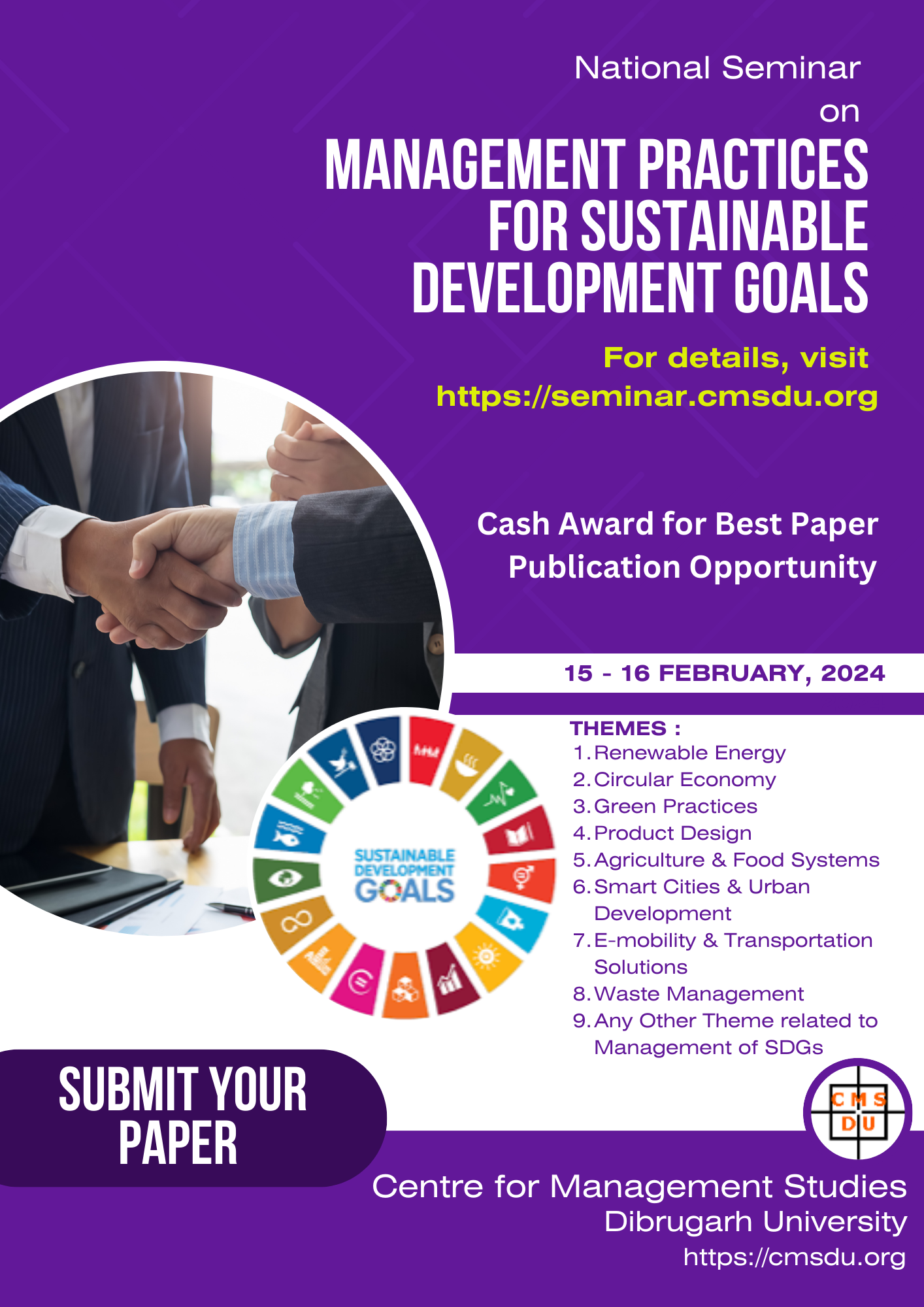 The Sustainable Development Goals (SDGs) which are 17 in number were adopted in 2015 and are supposed to be achieved by 2030. There is an increasing need to adopt management practices in the SDGs. The National Seminar that is being organized will focus on the management of the SDGS. Academicians, Researchers and people from the Industry are called upon to present their original research in this seminar on the themes as mentioned below. They are also invited to attend the Seminar and be part of the deliberations.